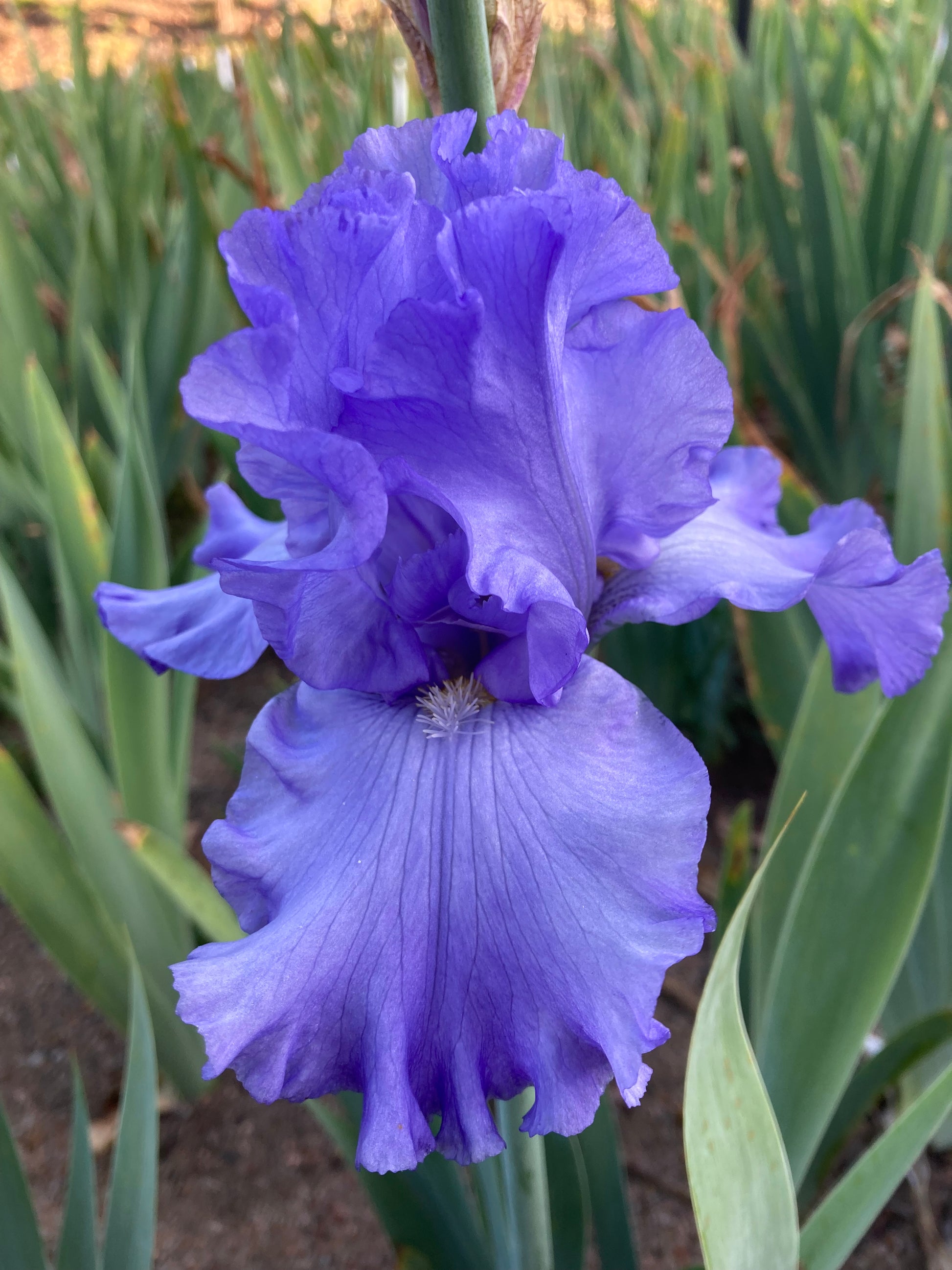 This midseason iris showcases medium-blue petals in a classic self-pattern, accented by striking blue beards tipped with sunny yellow for a subtle yet captivating contrast—perfect for adding depth and colour to your garden.