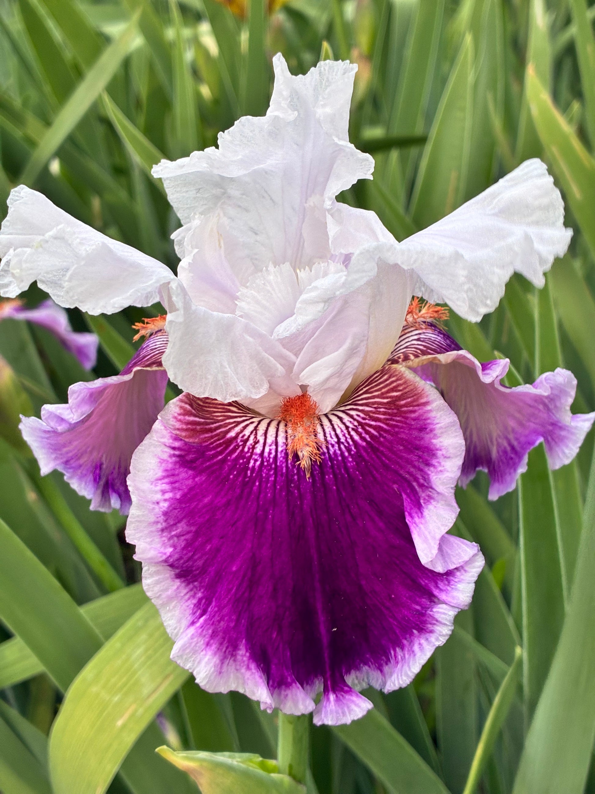 This vibrant tall bearded iris features standards that are white with a subtle strawberry blending up the centre, creating a soft, glowing effect. The style arms are white, complementing the standard’s delicate hue. The falls are rich strawberry, blending into a wide band of lighter strawberry that fades to a white border, adding depth and dimension. The beards are orange, providing a striking accent. Blooming in midseason, the flowers carry a slight fragrance, enhancing their lively and cheerful presence in the garden.