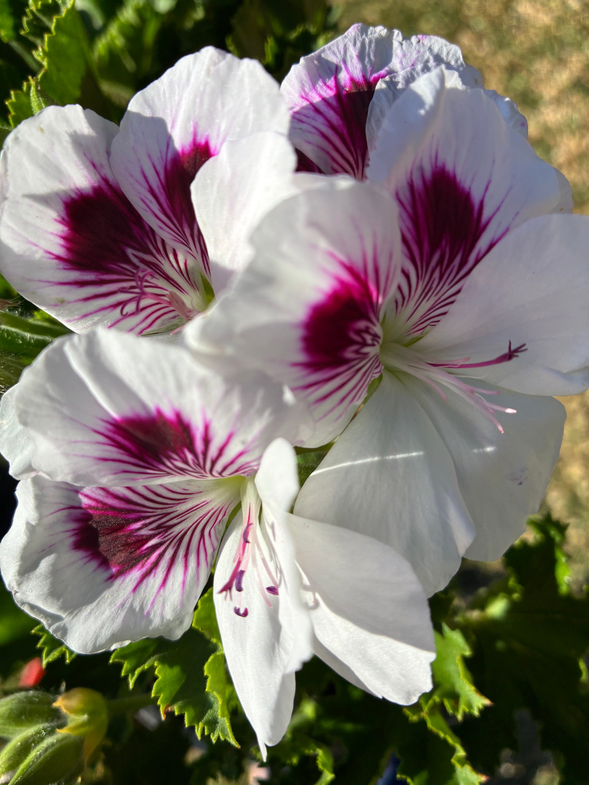 Pure white petals with magenta centres and magenta veining.
