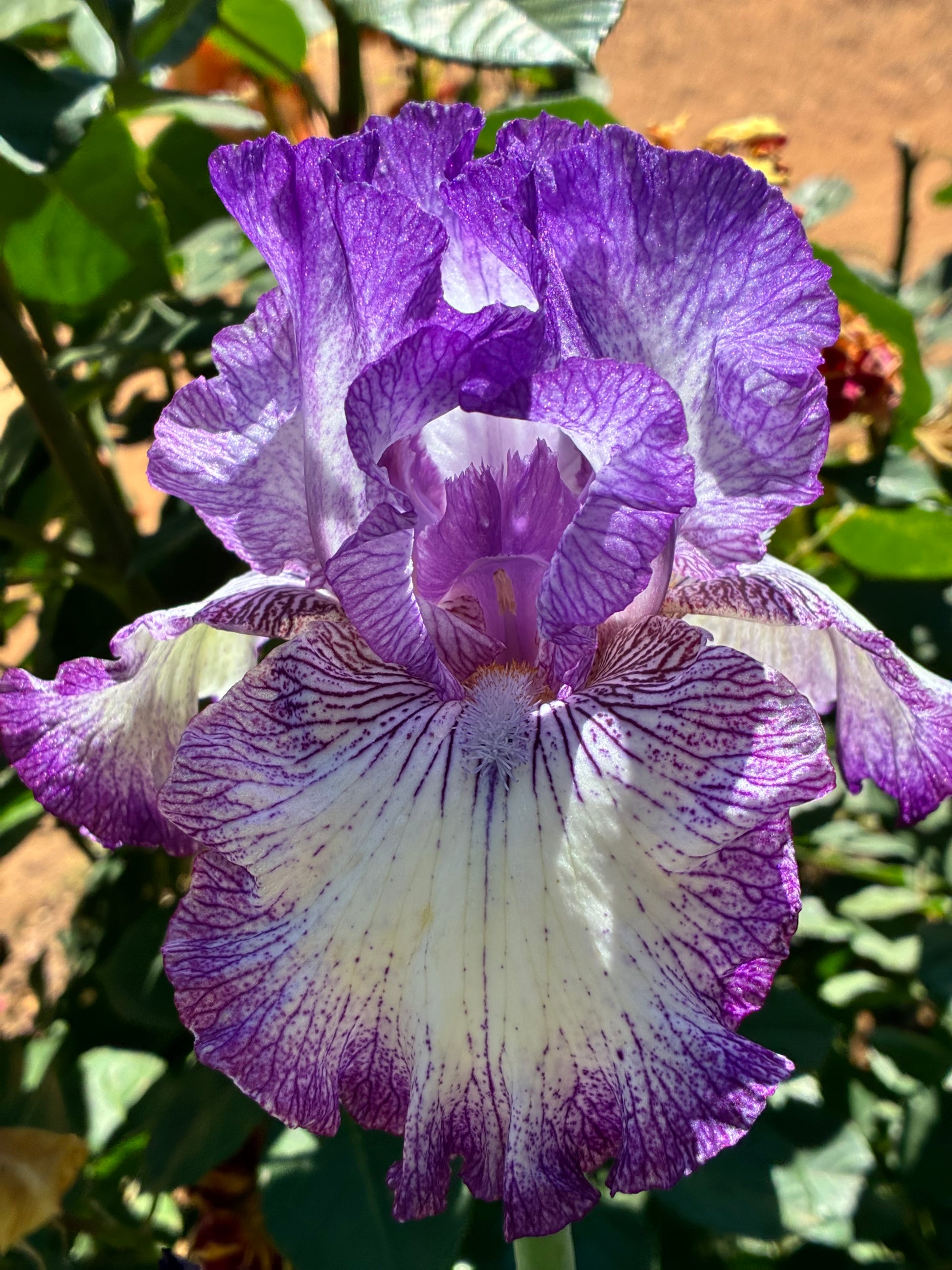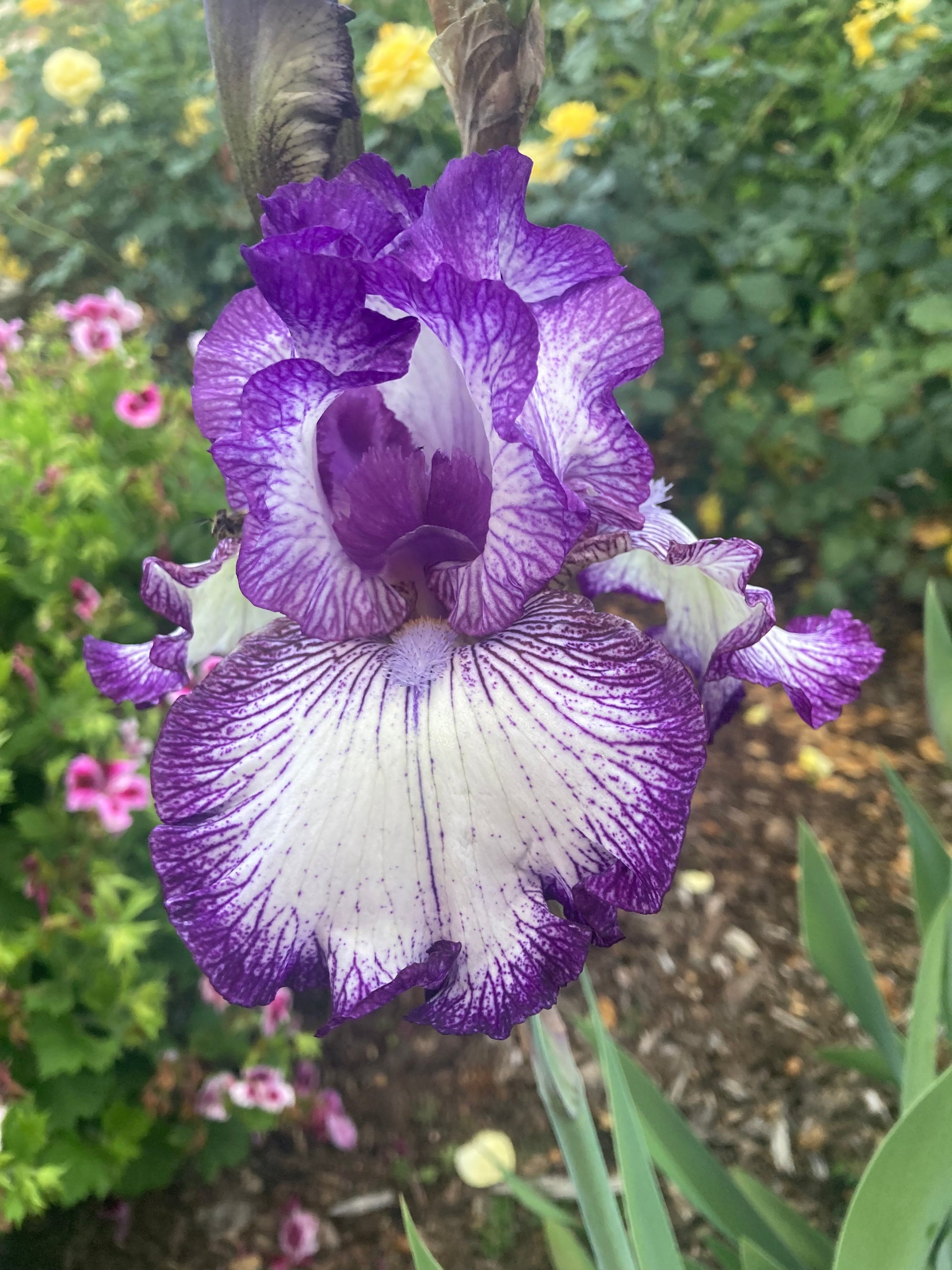 A striking very early bloomer with dark blue-violet standards featuring subtle white centre marks and blue-violet style arms. The falls are white with a 12 mm stitched dark blue-violet edge, complemented by yellow beards tipped with blue. A slight fragrance adds to its charm, making this iris a beautiful and elegant addition to any garden.