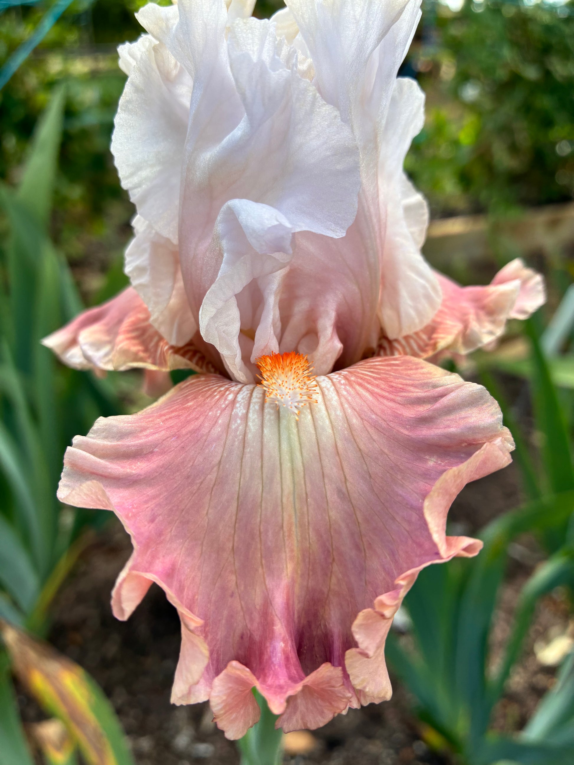 Very early bloom. Standards white, slight pink cast at edge; falls soft pink, lighter center area, deeper pink edge; beards light tangerine.