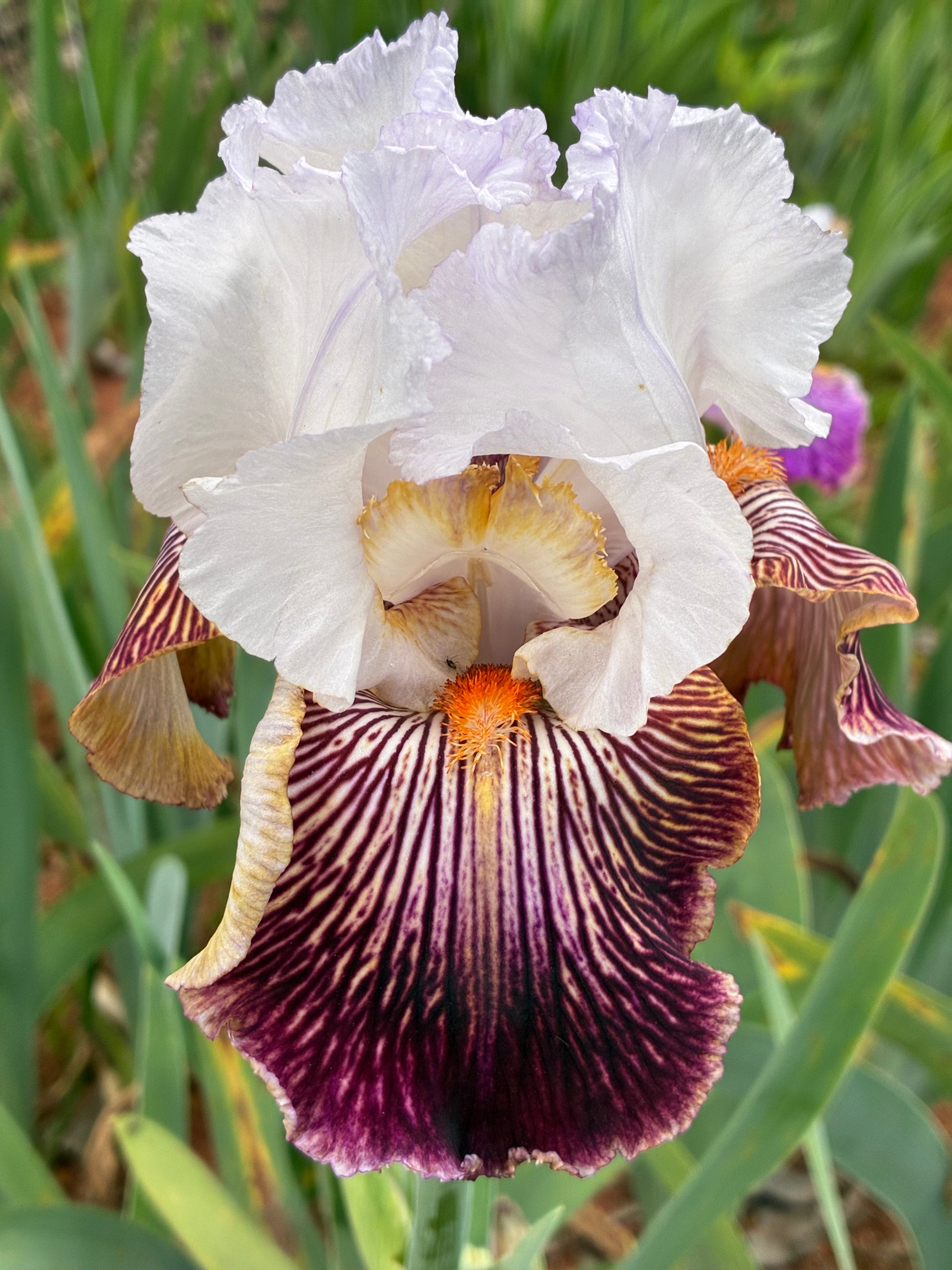 This striking tall bearded iris features icy white standards and style arms with old gold crests, paired with falls in white shaded with salmon. The falls display thick purple lines extending from the throat, darkening down the petal and ending in a dotted purple-white band, with a purple rim line and shoulders heavily veined in light brown. The beards are red-coral, adding vibrant contrast, and the blooms carry a slight sweet fragrance.