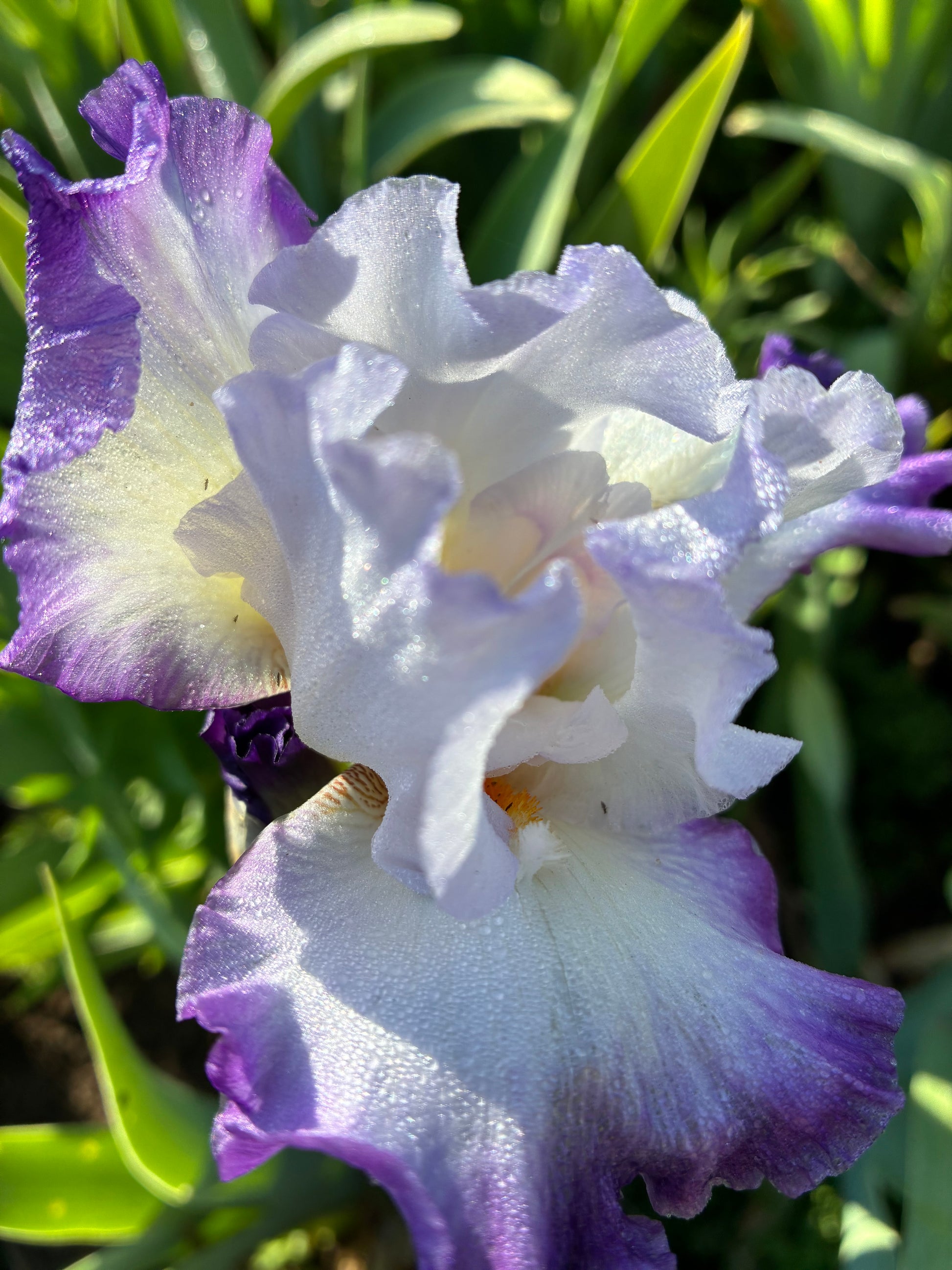 This midseason-to-late iris features white standards lightly infused with pale violet-blue along the edges. The falls are white, gradually suffusing to a deep, bright amethyst-violet edge. White beards tipped with tangerine add a subtle pop, creating a striking and elegant garden display.