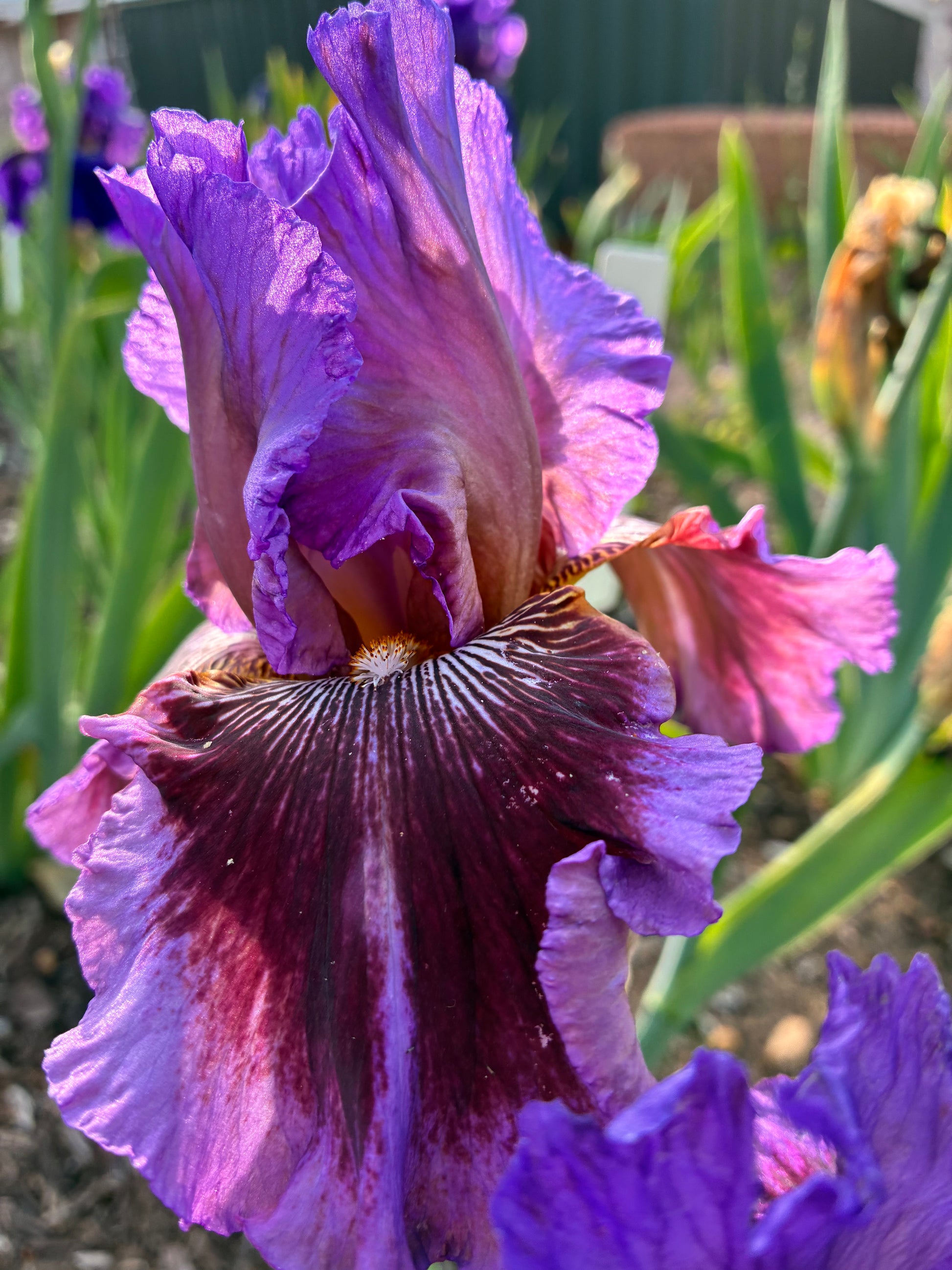 This striking iris showcases bright blue-violet standards and matching falls, each accented by a dramatic ruby-black pumila signal that spreads across half the petal. The blue-violet beards, tipped with warm bronze at the throat, add beautiful depth and contrast. Lightly sweet-fragranced and loaded with character, this variety makes a bold and unforgettable addition to any garden.