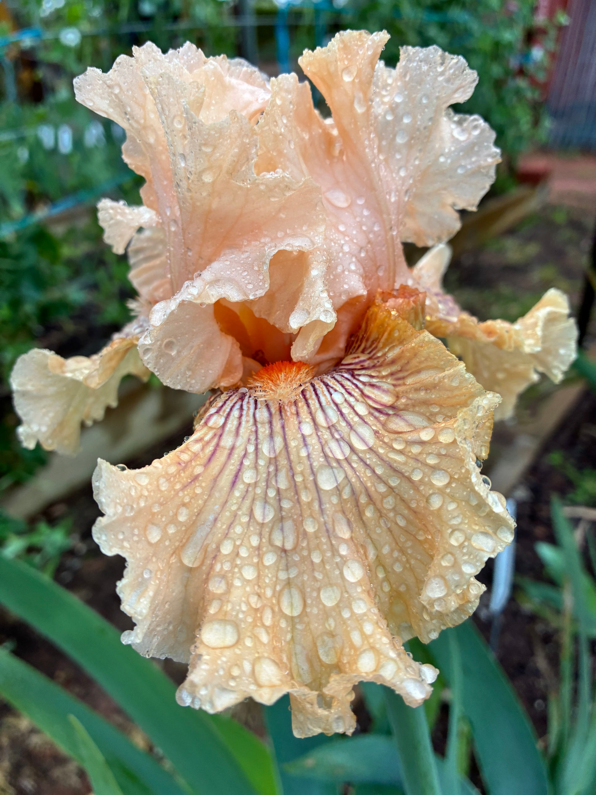 Peach falls and standards, grape purple veined falls , tangerine beard, very early blooming in the season. Bubbly ruffles