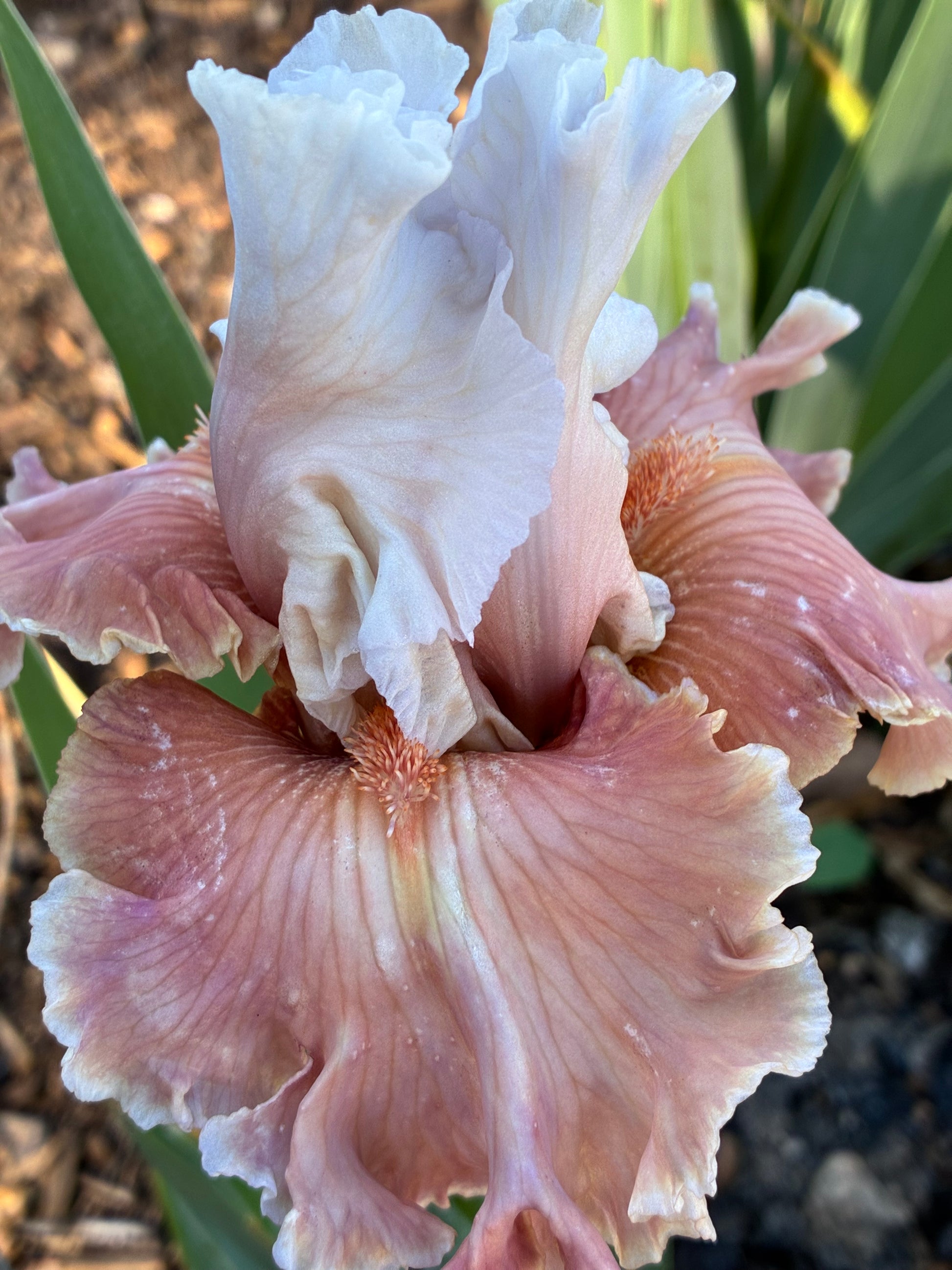 A captivating late midseason bloomer with oyster-white standards accented by pink midrib veining that extends toward the edges, paired with falls in a warm cocoa rose-pink. Its tangerine beards provide a lively pop of colour, creating a stunning and elegant contrast. Perfect for adding warmth and sophistication to any garden display.
