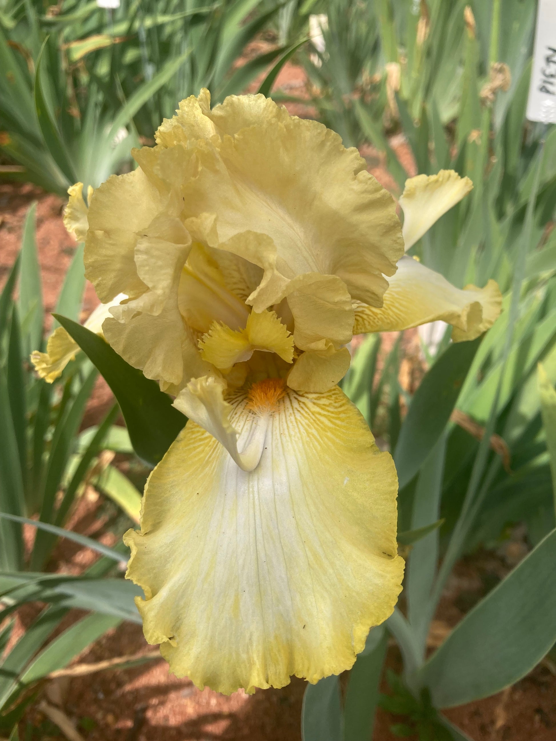 Early to mid season blooming , standards chrome yellow, edged sulphur yellow, style arms sulphur yellow. Beards tangerine.