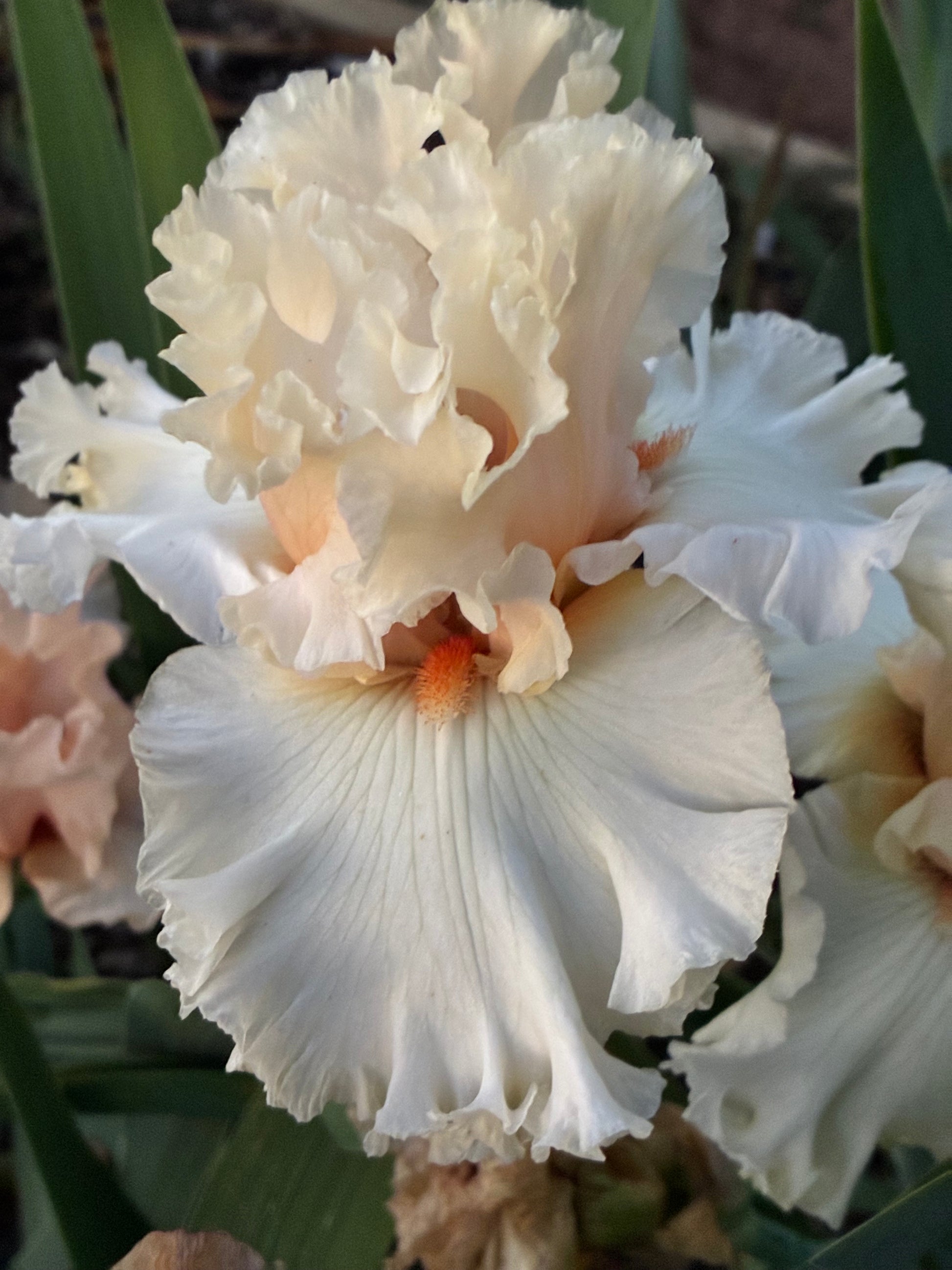 A delightful early-to-midseason bloomer with pastel pink standards subtly deepening to peach at the midrib, paired with creamy white falls and soft peach-coloured hafts. Its white beards tipped with tangerine provide a gentle pop of colour, complemented by a light, sweet fragrance. A graceful and charming addition to any garden, perfect for soft, romantic colour schemes.