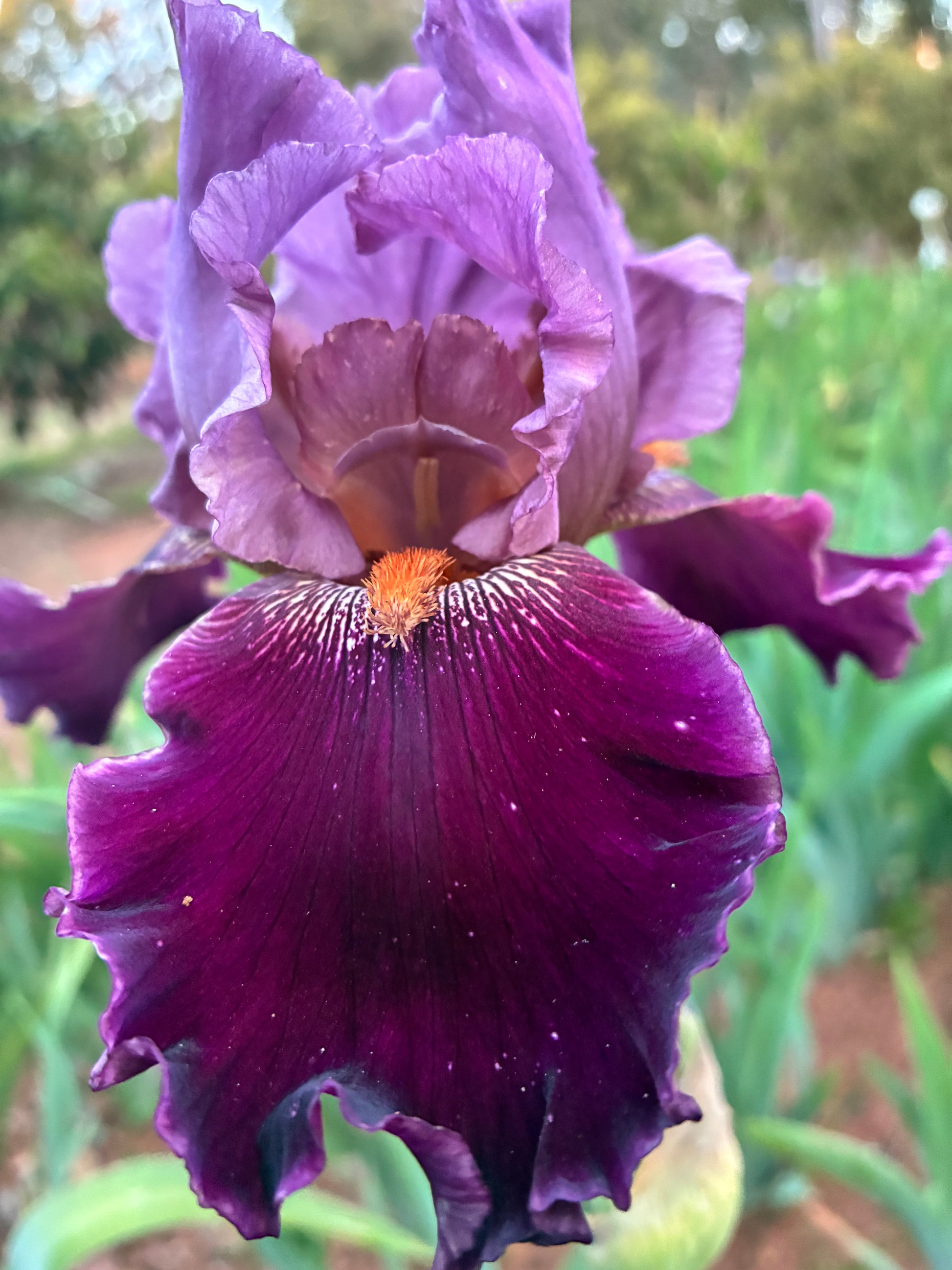 Midseason bloom. Standards lilac, falls bright magenta plum, lilac edge; beards tangerine; sweet fragrance.