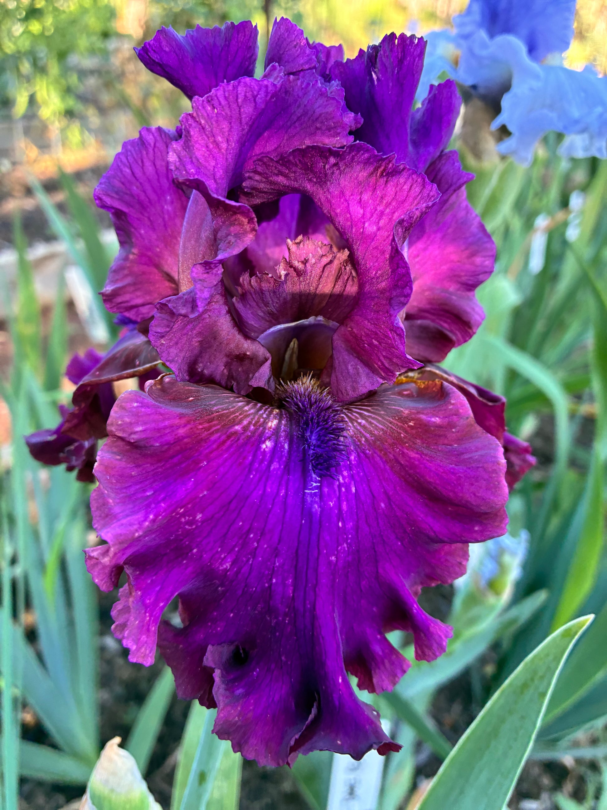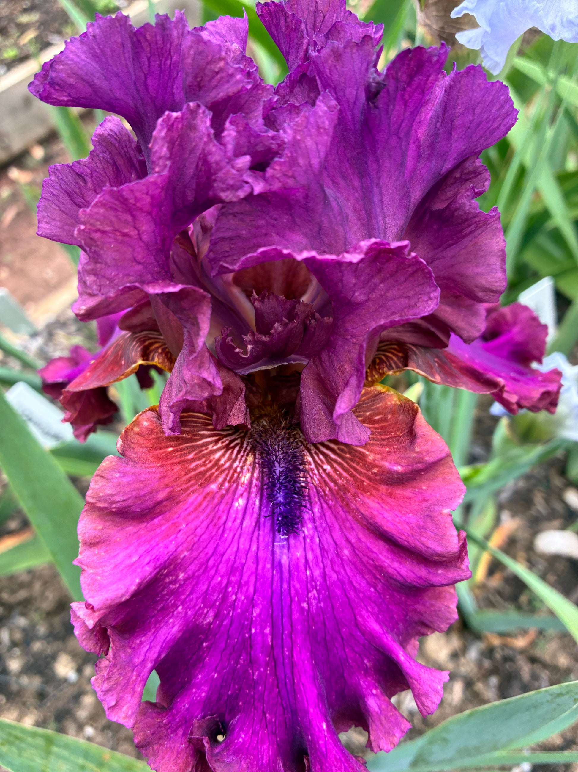 Midseason bloom. Standards light magenta-burgundy, bronze blush at midrib; falls bright light magenta-burgundy, bluish wash at center, bronze hafts; beards bronze, outer half purple bronze; slight sweet fragrance.
