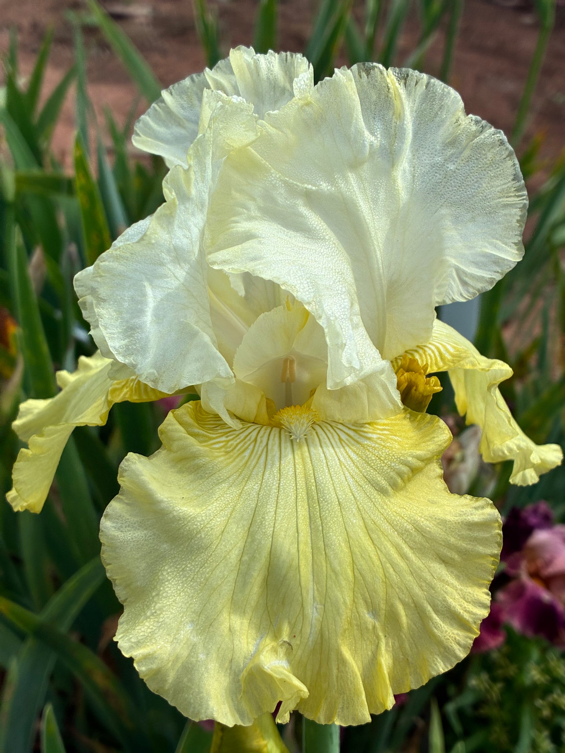 This very early-flowering iris grows tall and elegant, featuring crisp white standards paired with pale chartreuse-yellow falls, creating a fresh and striking addition to any garden.