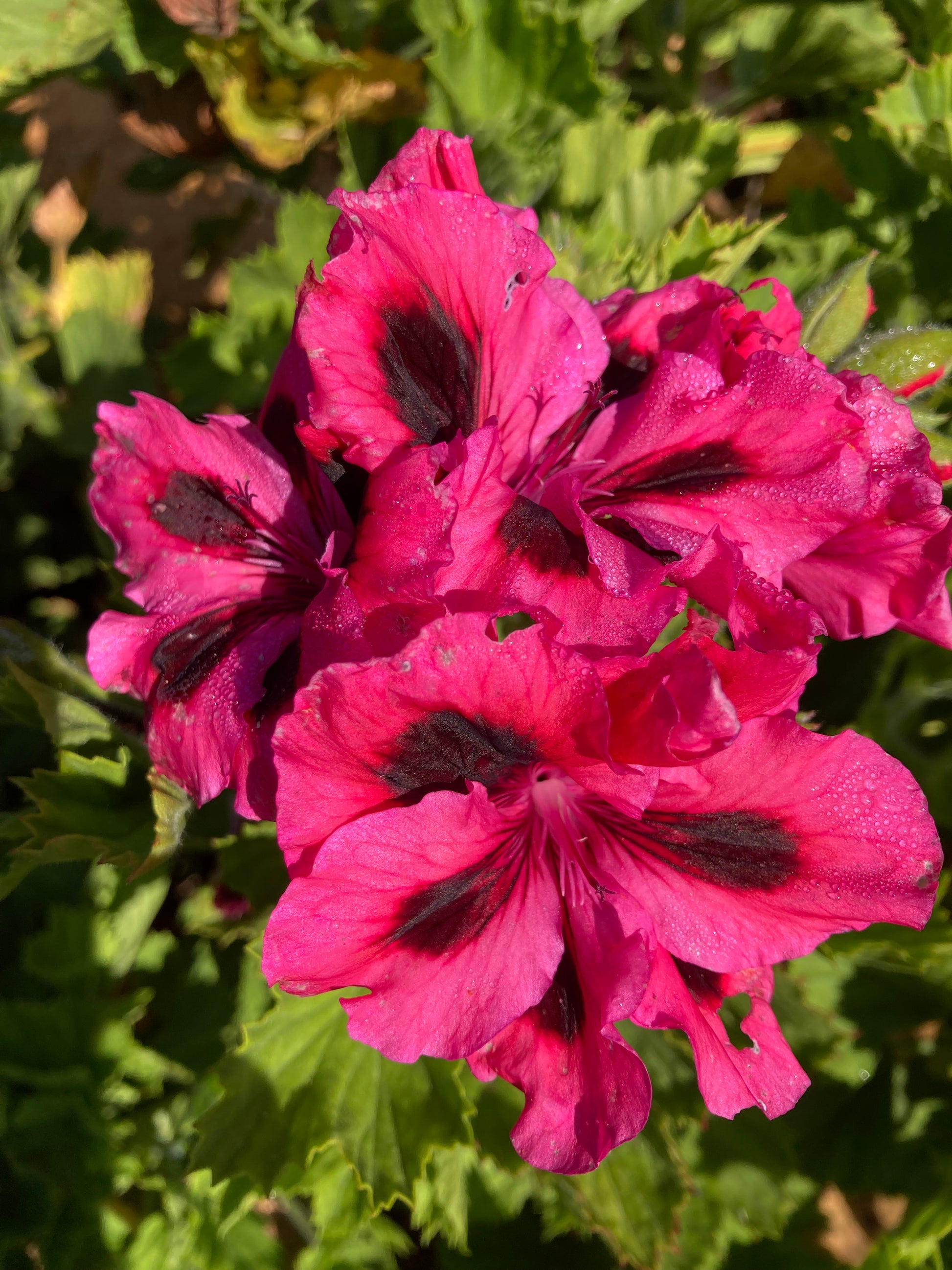 Deep vibrant pink petals with dark black centres, a prolific flowering regal pelargonium. Hight 1metre x 1 metre high.